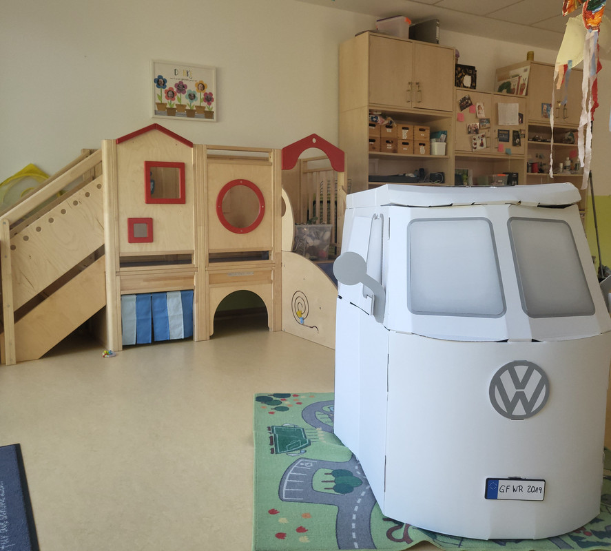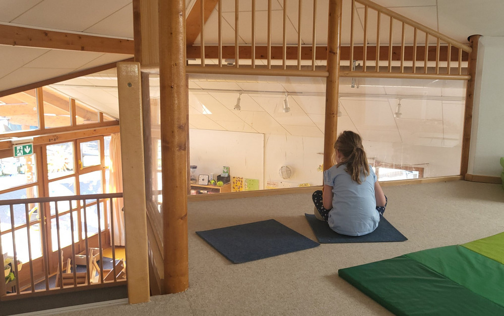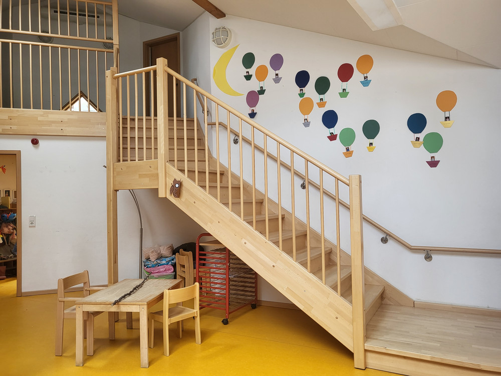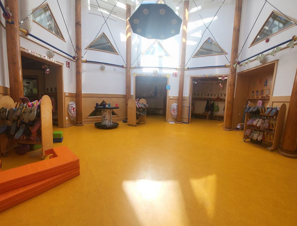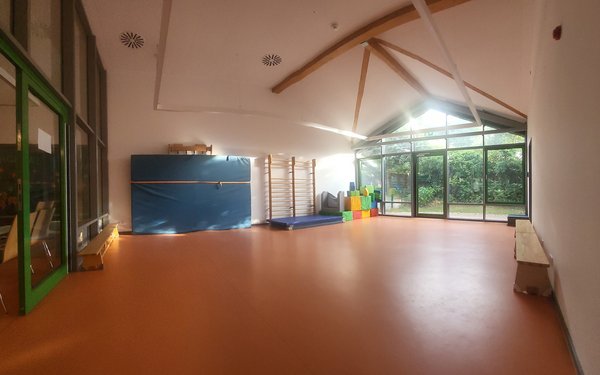 Im „alten“ Kindergartentrakt verfügen alle Gruppenräume über eine Hochebene und Galerie, mit der die Räume untereinander verbunden sind. Im Neubau wurde eine Bewegungshalle integriert, die von allen Gruppen genutzt werden kann.
